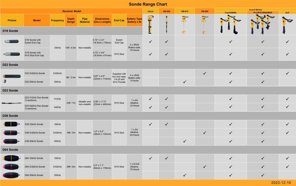 Sondes come in a variety of sizes which ties into how deep they can be located. Different frequencies are available which allow sondes to be located in metallic or non-metallic pipes and ducts.