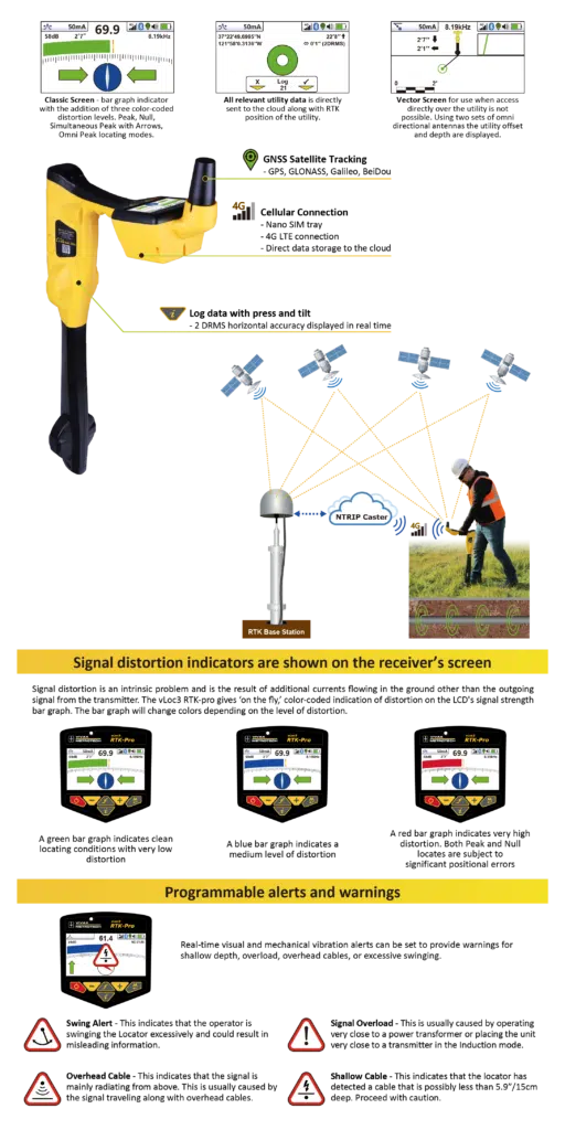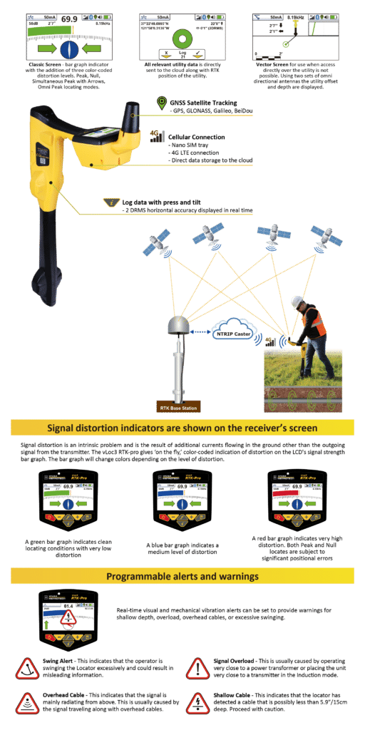 The vLoc3 RTK-Pro receiver is the first to add RTK GNSS accuracy to a utility locator. Using the RTK-Pro internal cellular module with 4G LTE capabilities, the operator has the ability to connect to NTRIP RTK (Real-Time Kinematic ) caster that provides RTCM 3 corrections. By utilizing these corrections, the operator can collect both utility location data along with the geographical location of the utility with survey-grade accuracy.